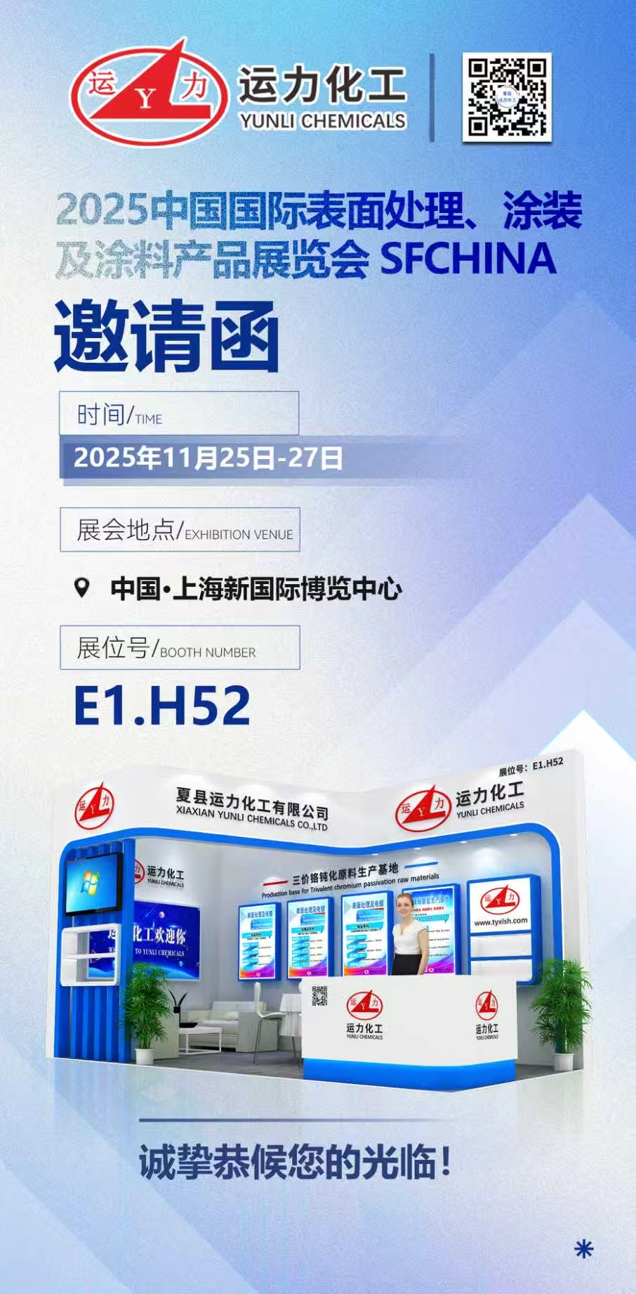 夏县运力化工有限公司将于11月25-27日参加于上海新国际博览中心E1区举行的2025「中国-上海CHINACOAT」/「中国国际表面处理展 SFCHINA」,我司展台号为: E1馆H52展位